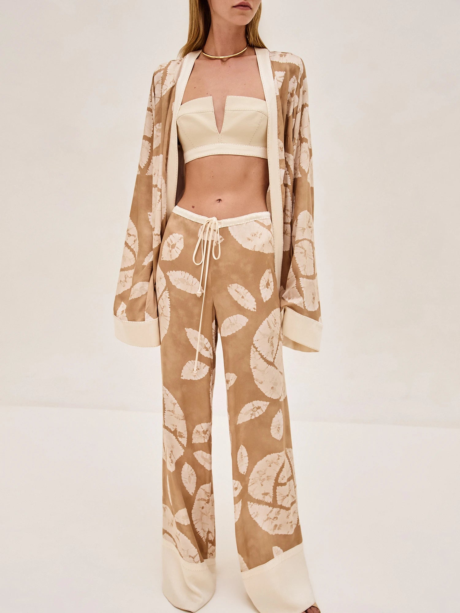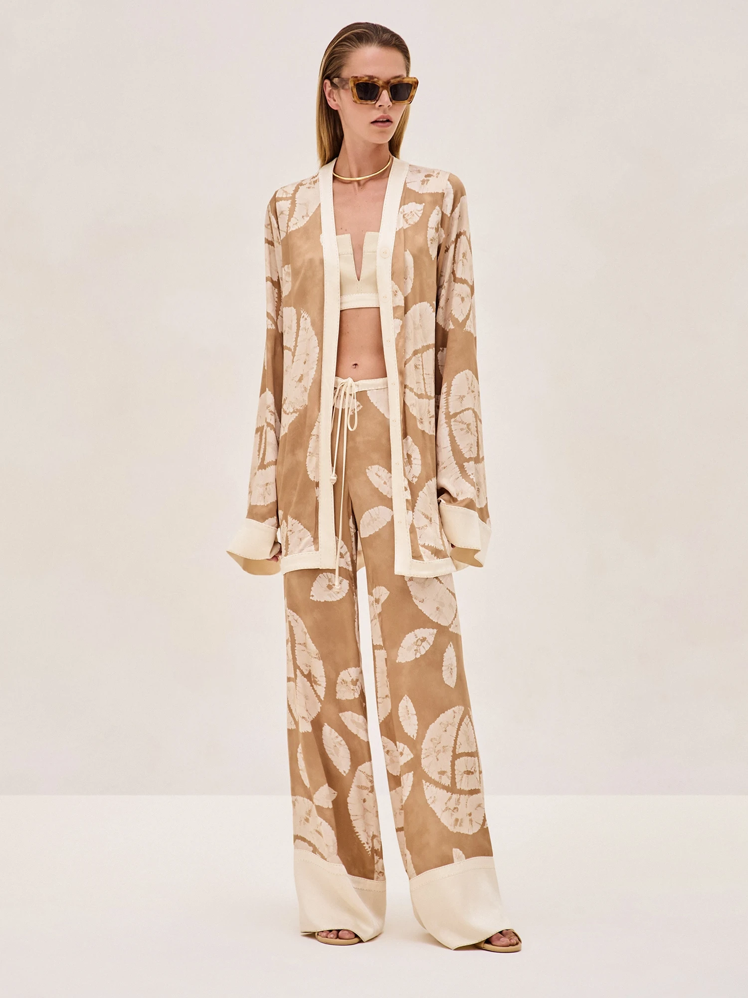 The Marek Dress offers effortless versatility with its robe-inspired design and tie-waist detail. It can be worn as a standalone mini dress or styled open over the Tiani Pant for a chic layered look. Featuring long sleeves, button detail and contrast trim, the Marek Dress seamlessly transitions from relaxed daywear to elevated evening style.