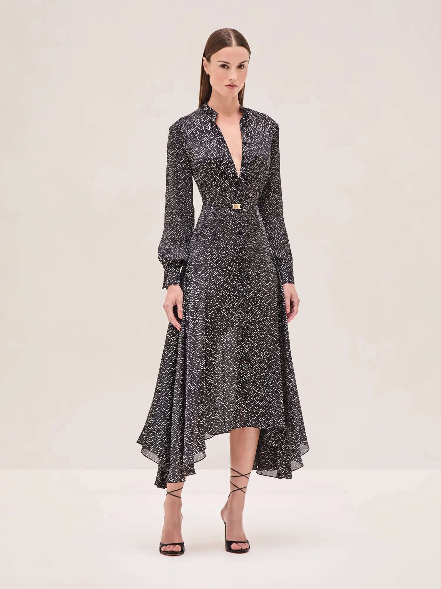 The Monico Dress is a button-down maxi dress with collared long sleeves, finished with a gold metal scrunch belt at the waist.