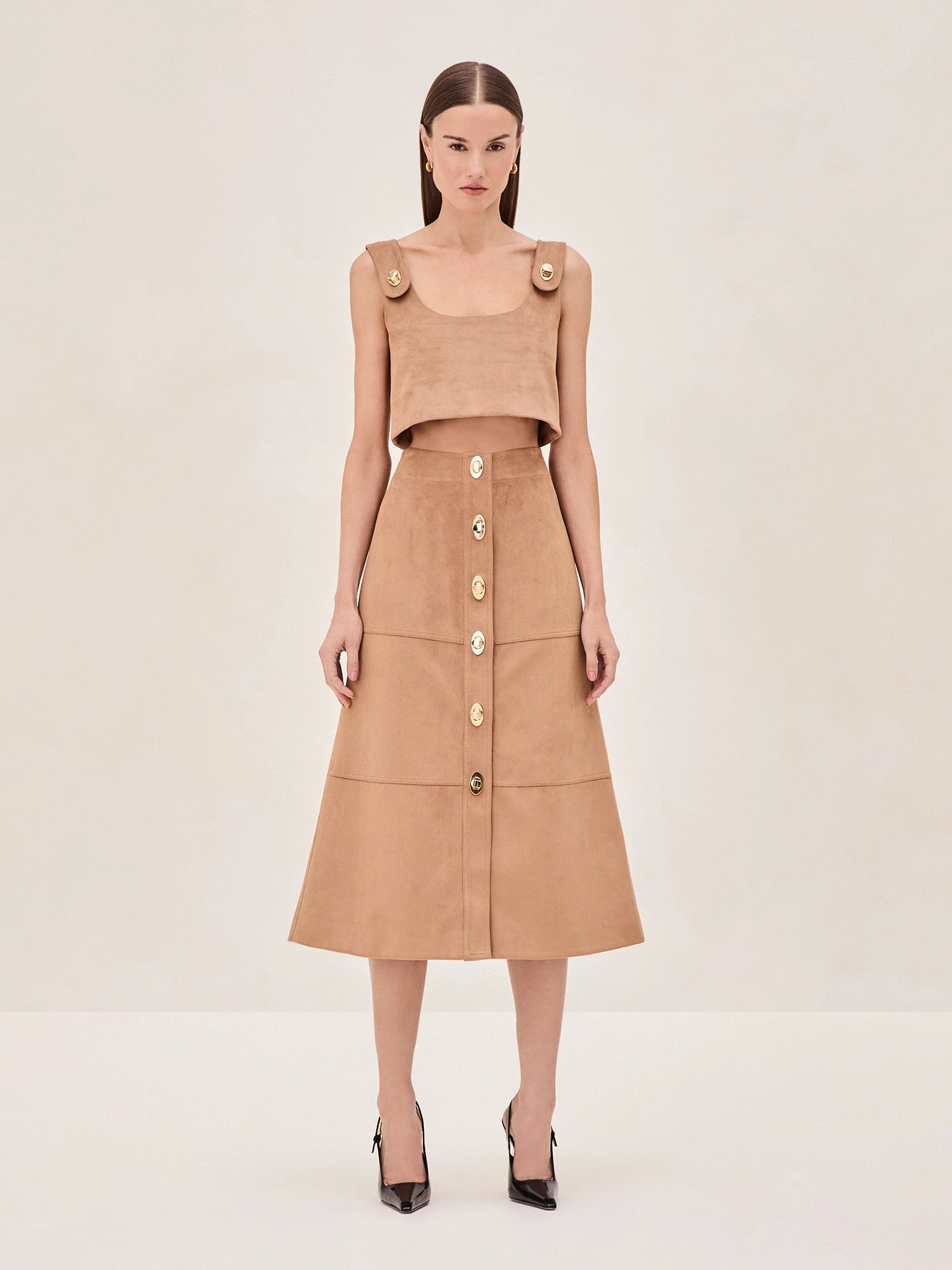 Introducing the Norie Top - the new must-have for a chic and effortless look. Its sleek cropped fit and dazzling gold button accents strike the perfect balance between minimalism and luxury. Combine it with the Sinead Skirt for a stunning, sophisticated ensemble that is sure to turn heads.