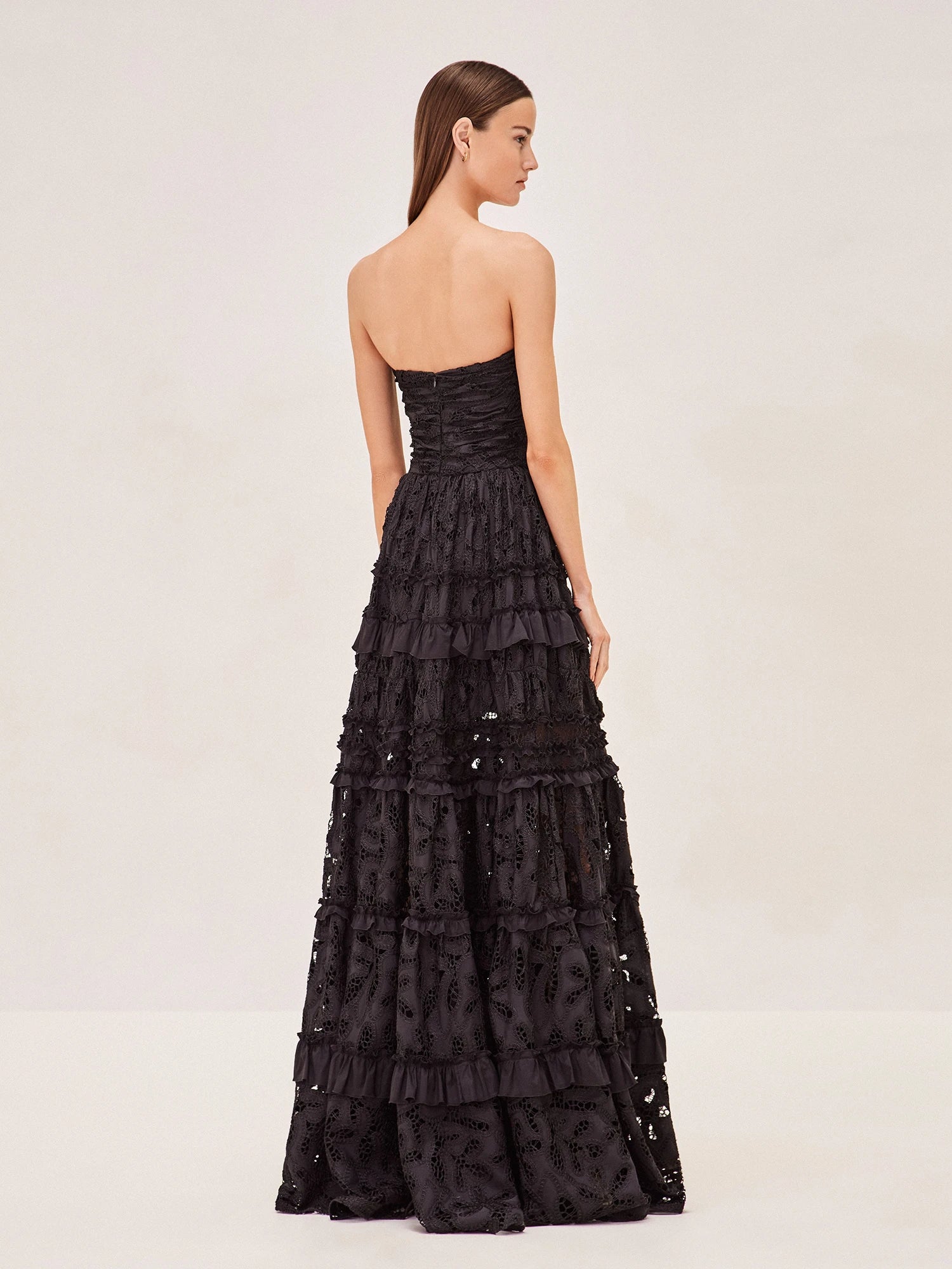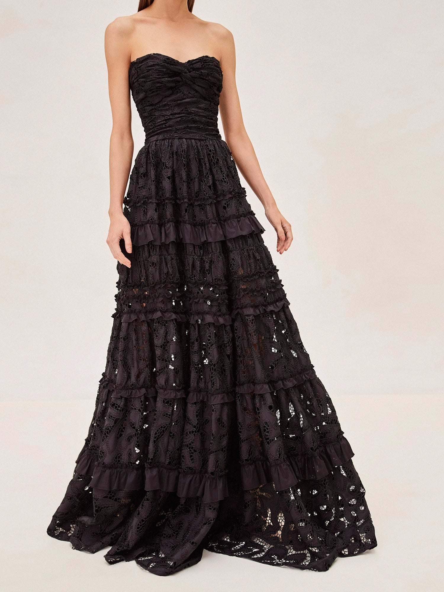 The Ottilie Dress is a vision in lace, featuring a strapless bodice that flows into layers of delicate, tiered lace. Each ruffle adds a touch of romance, making it a stunning choice for any event.