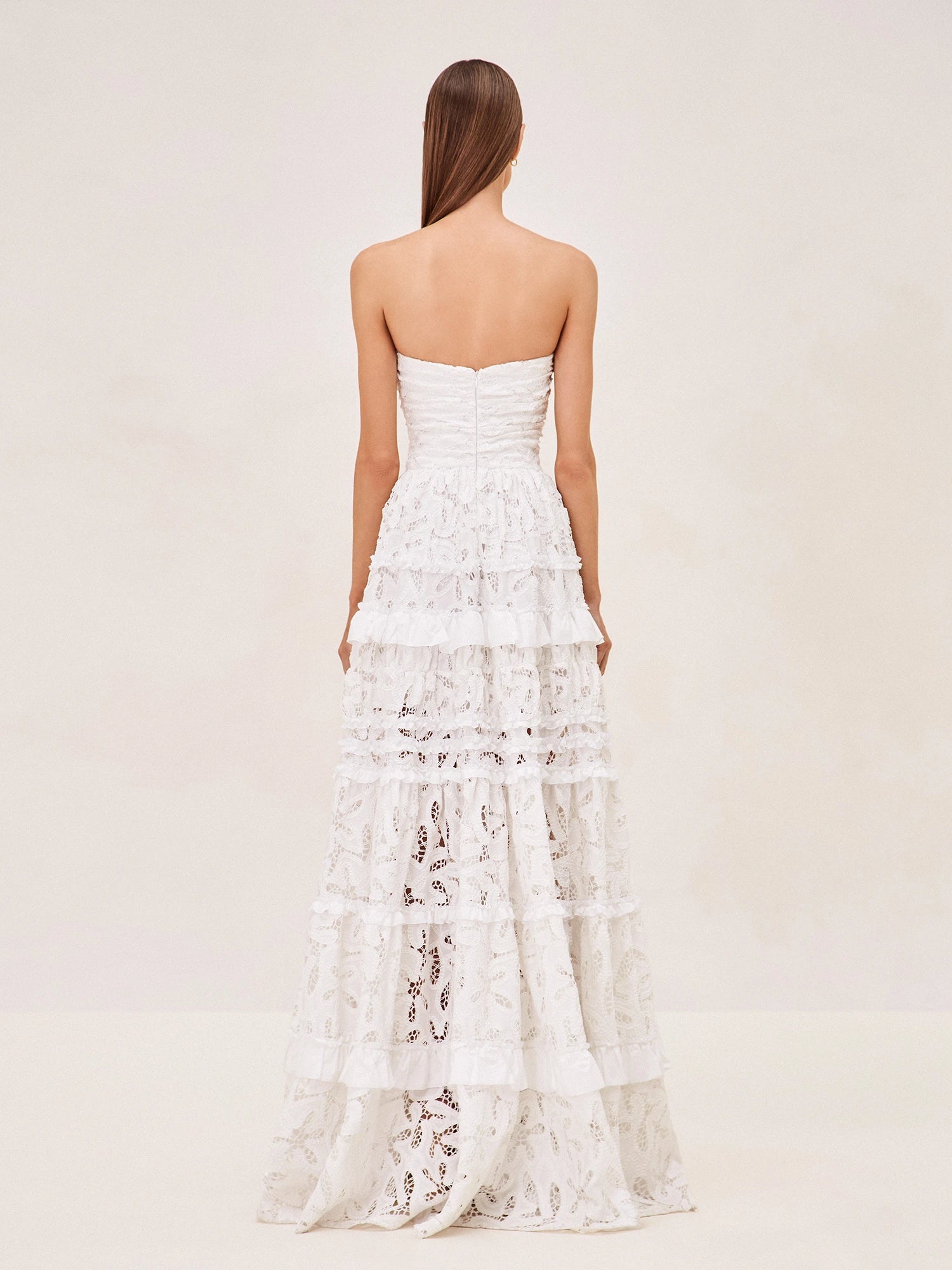 The Ottilie Dress is a vision in lace, featuring a strapless bodice that flows into layers of delicate, tiered lace. Each ruffle adds a touch of romance, making it a stunning choice for any event.