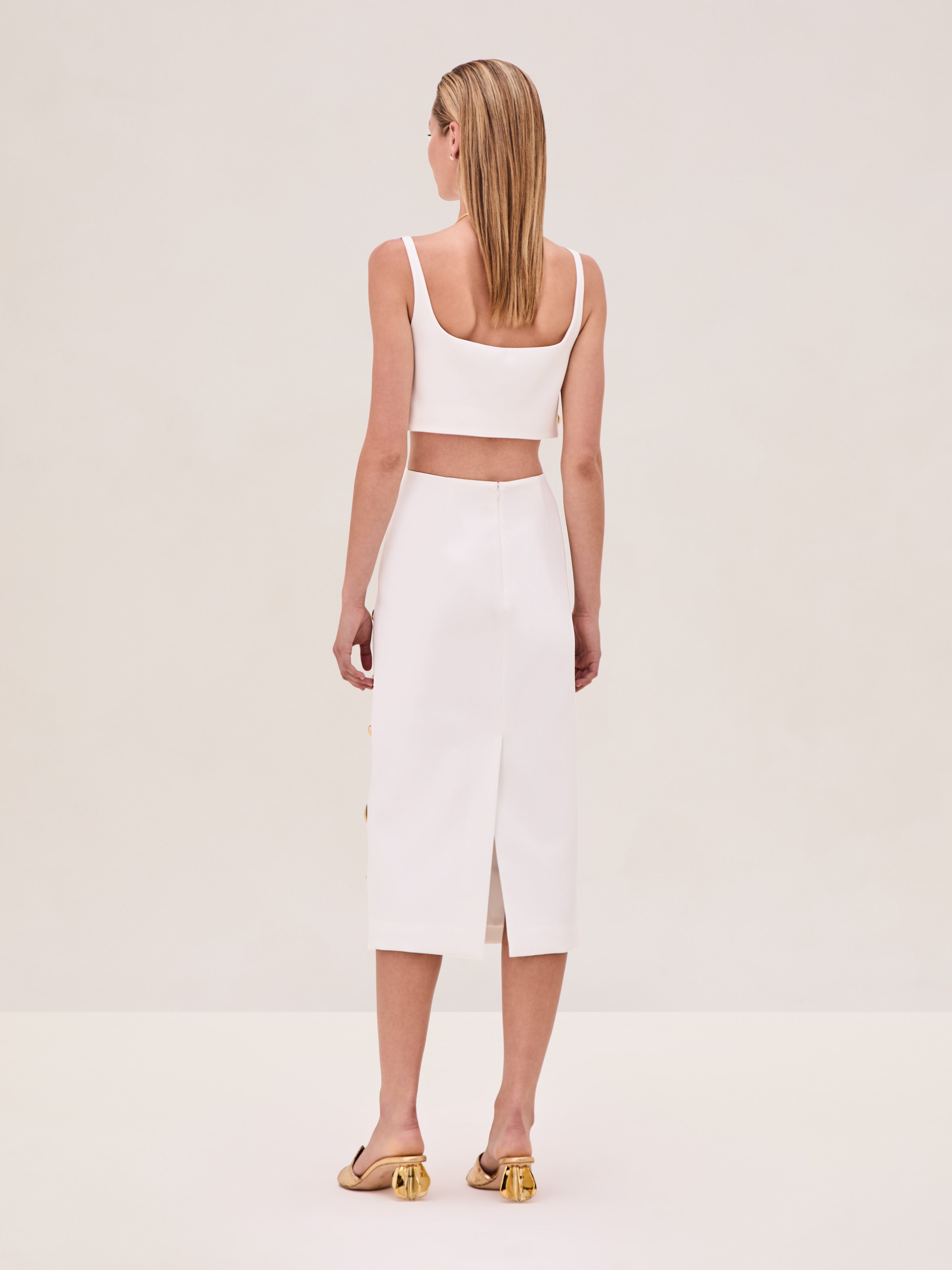 The Pamila Skirt is a high-waisted fitted midi with gold hand-sewn appliqués, paired with the Lya Top.