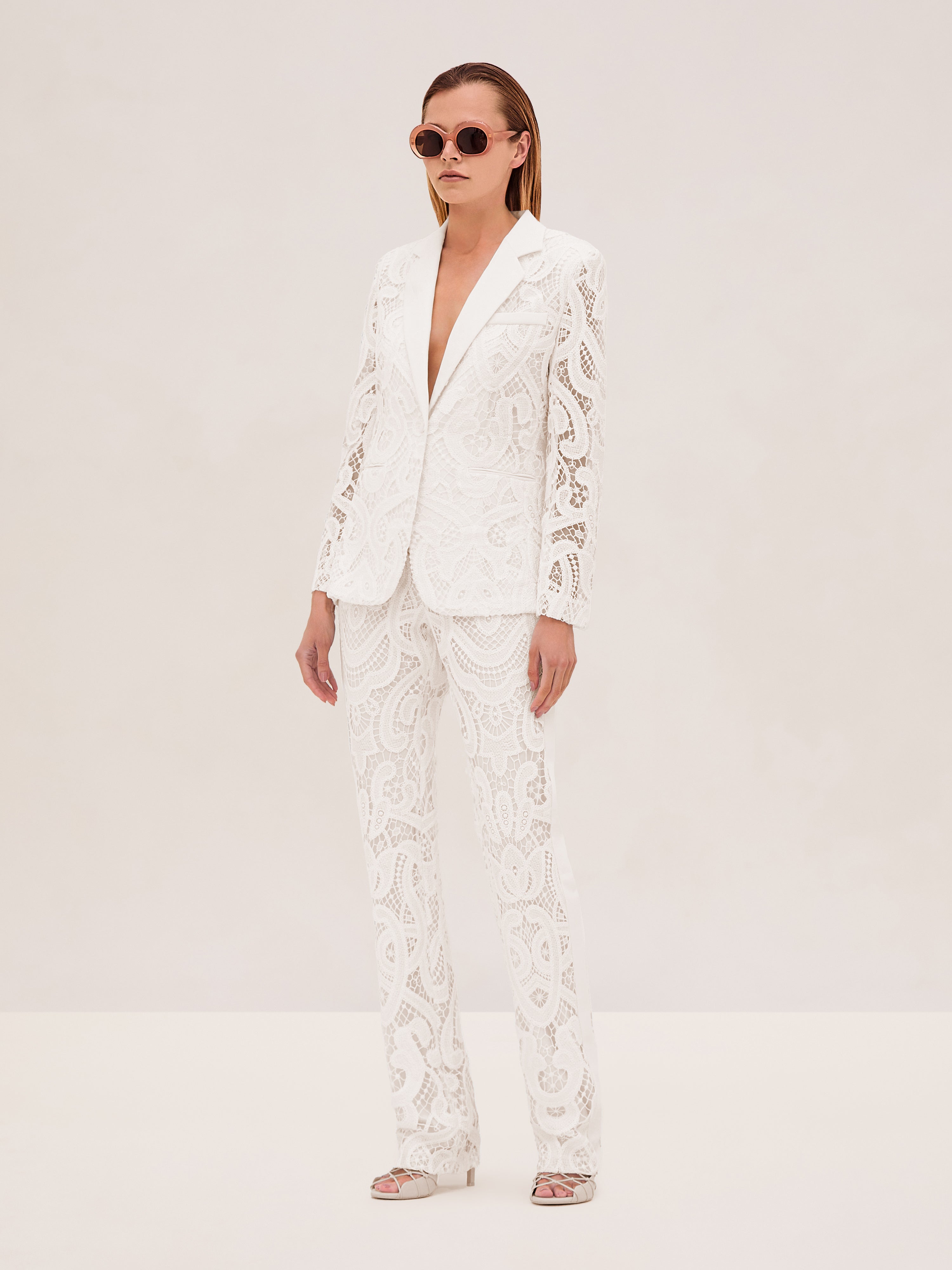 The Pierre Pants redefine suiting with their sophisticated lace detailing and tailored silhouette. Designed to elongate the legs with a flattering straight cut, these pants balance structure and elegance effortlessly. Pair them with the matching Lowel Jacket for a cohesive suiting look that’s both modern and refined.