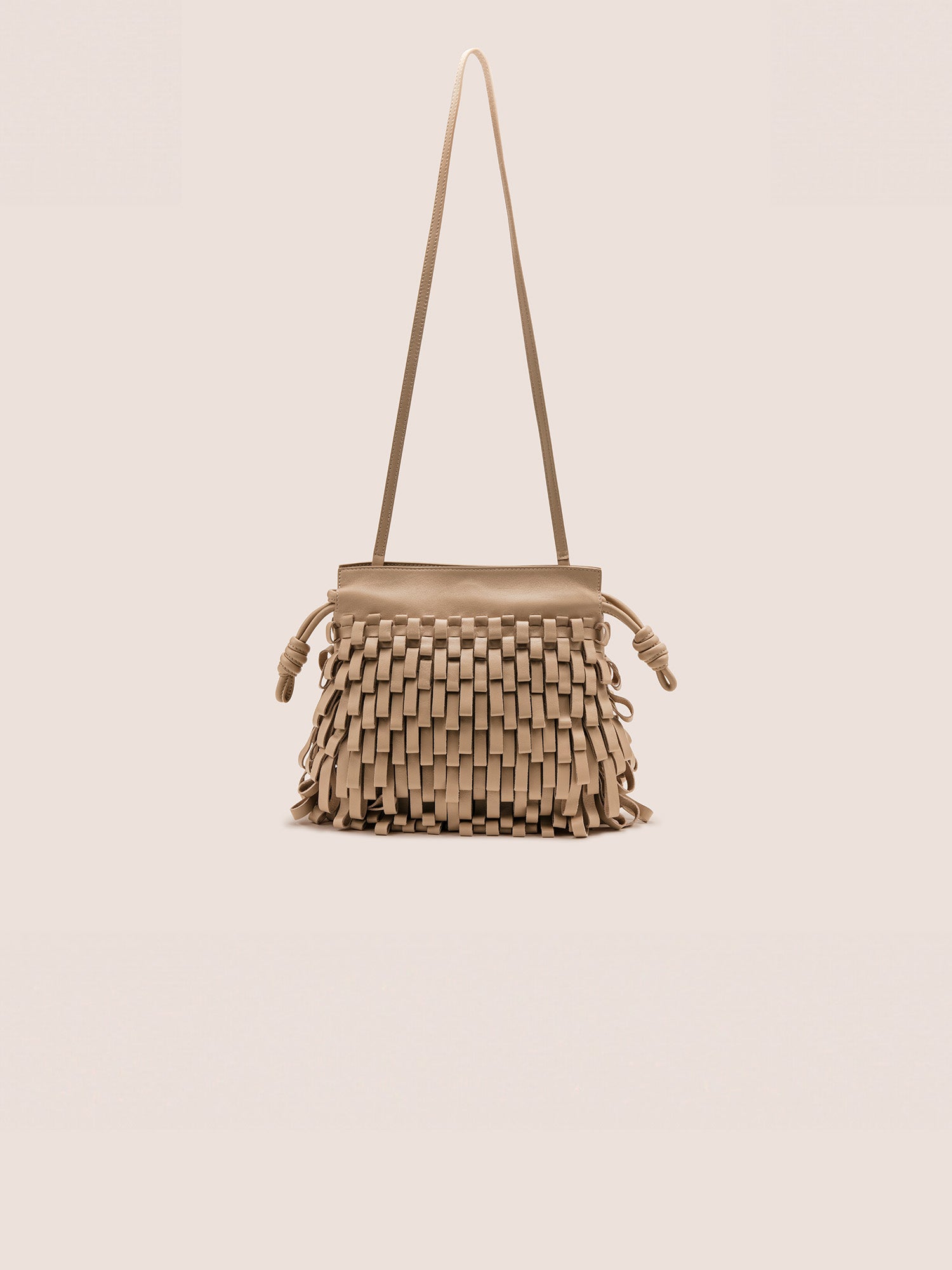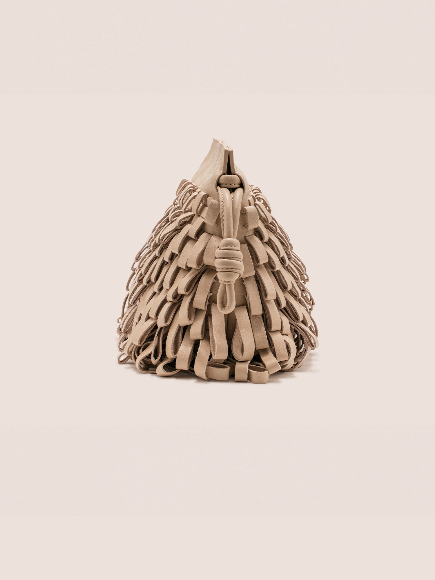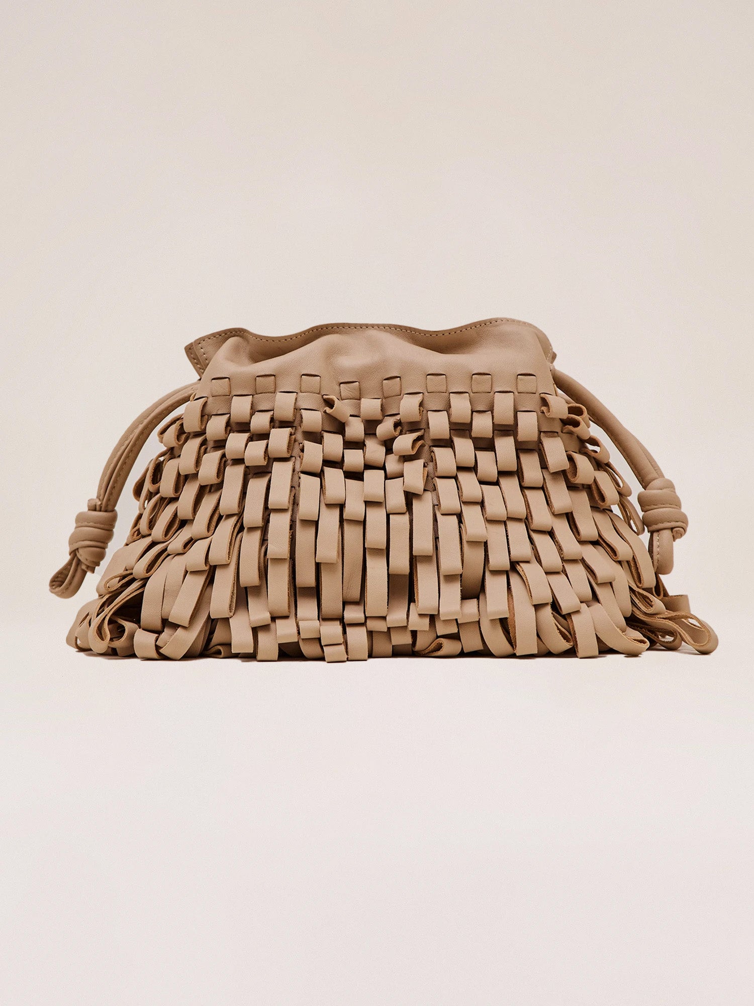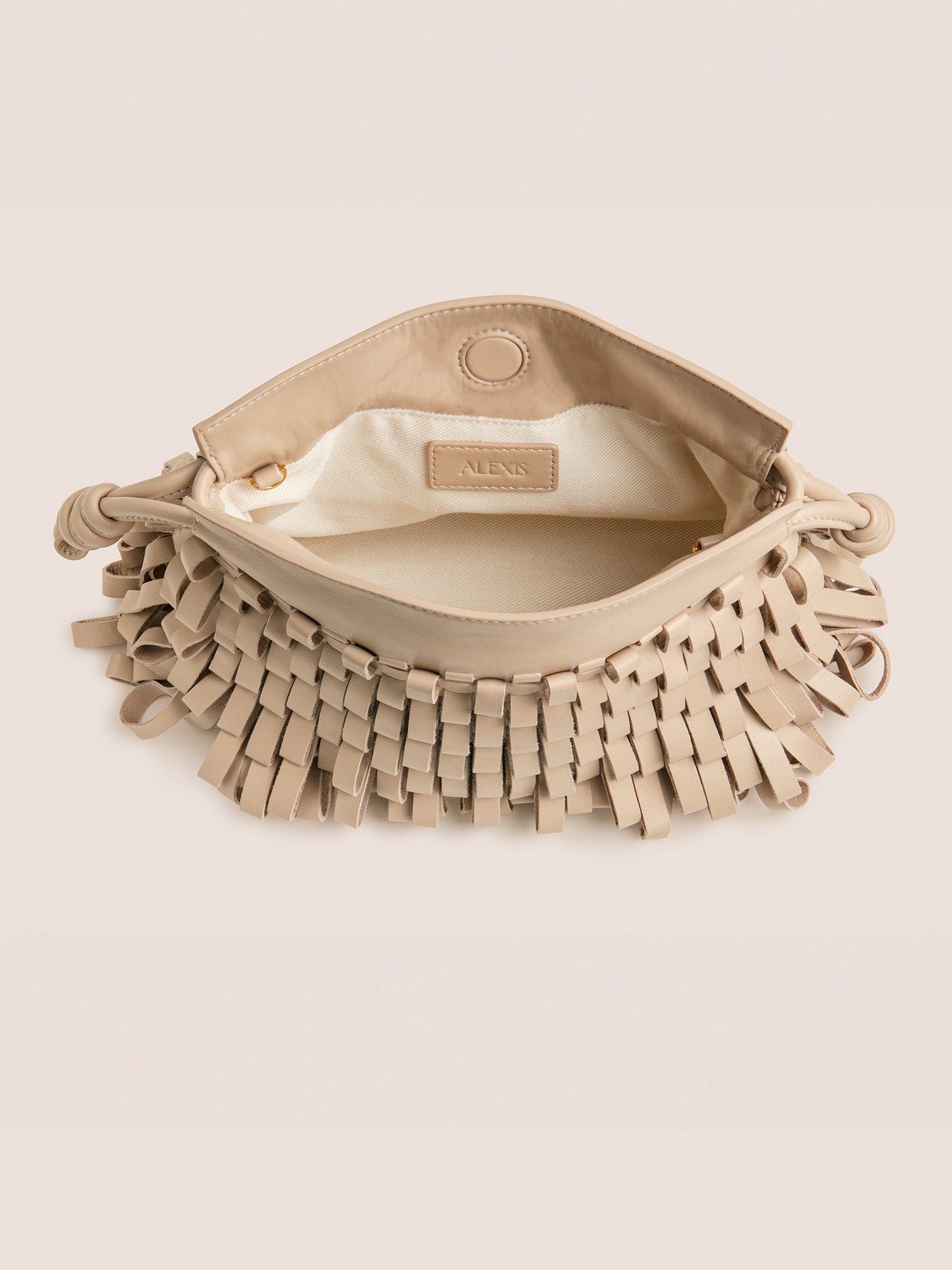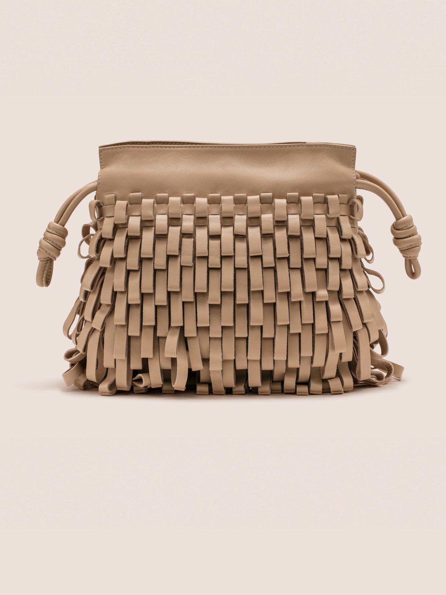 The Quinn clutch features a distinctive hand-woven leather fringe loop design, combining texture and craftsmanship in a compact silhouette. It includes a detachable crossbody strap for versatile styling and is secured with a magnetic and cinch closure.