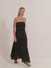 The Rasha Dress is a strapless midi dress with dimensional paneling and subtle cutouts.