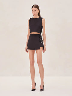 Introducing the Raylin Top. With its clean lines and modern silhouette, this top is elevated by the intricate floral appliqués along the sides, adding a delicate, feminine touch. The simple yet refined design makes it a versatile piece that effortlessly transitions from day to night. For a perfectly coordinated look, pair the Raylin Top with the Susie Skirt.