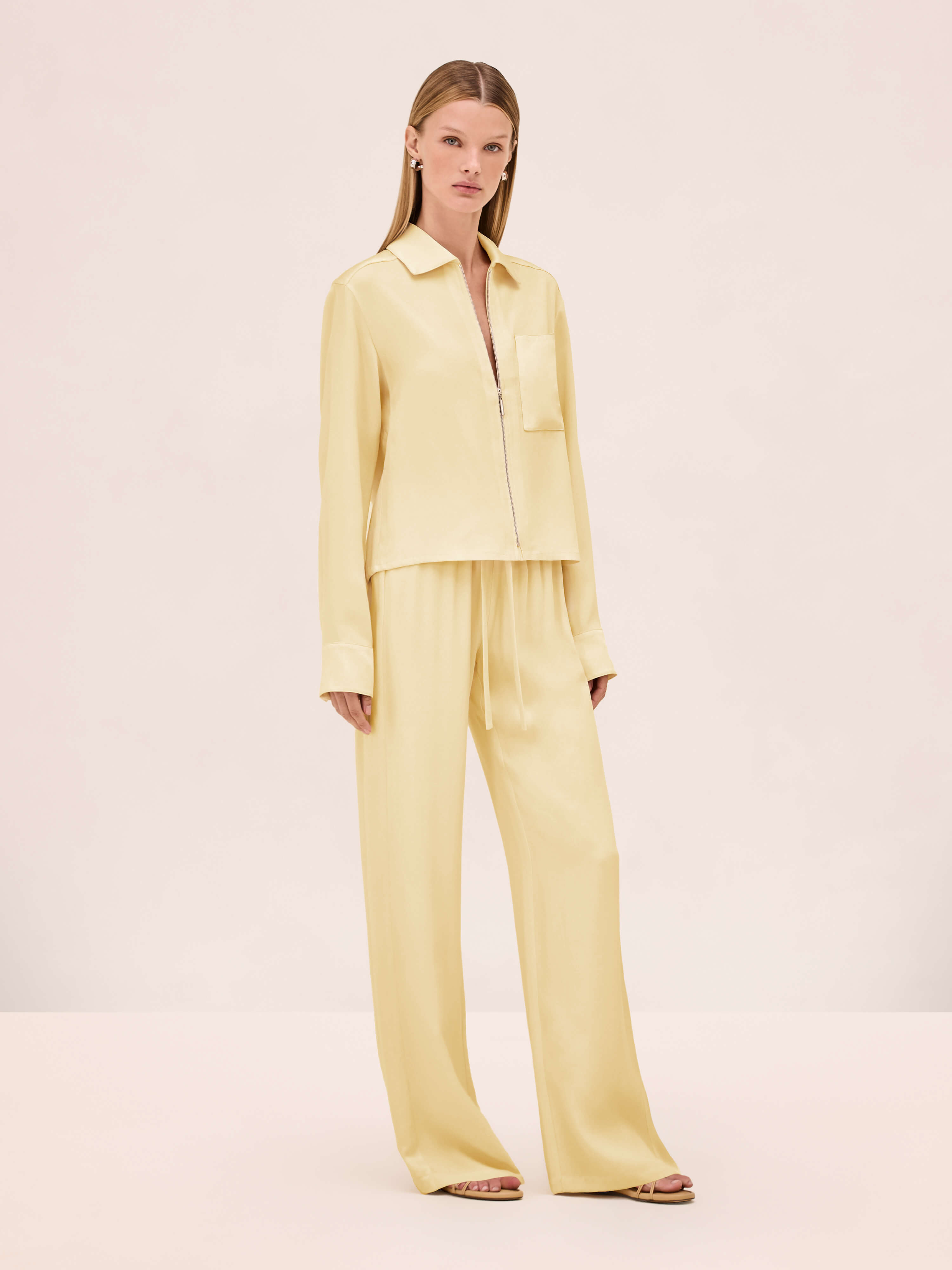 The Rowen Top is a zip-front collared design with a relaxed fit, paired with the Damian Pant.