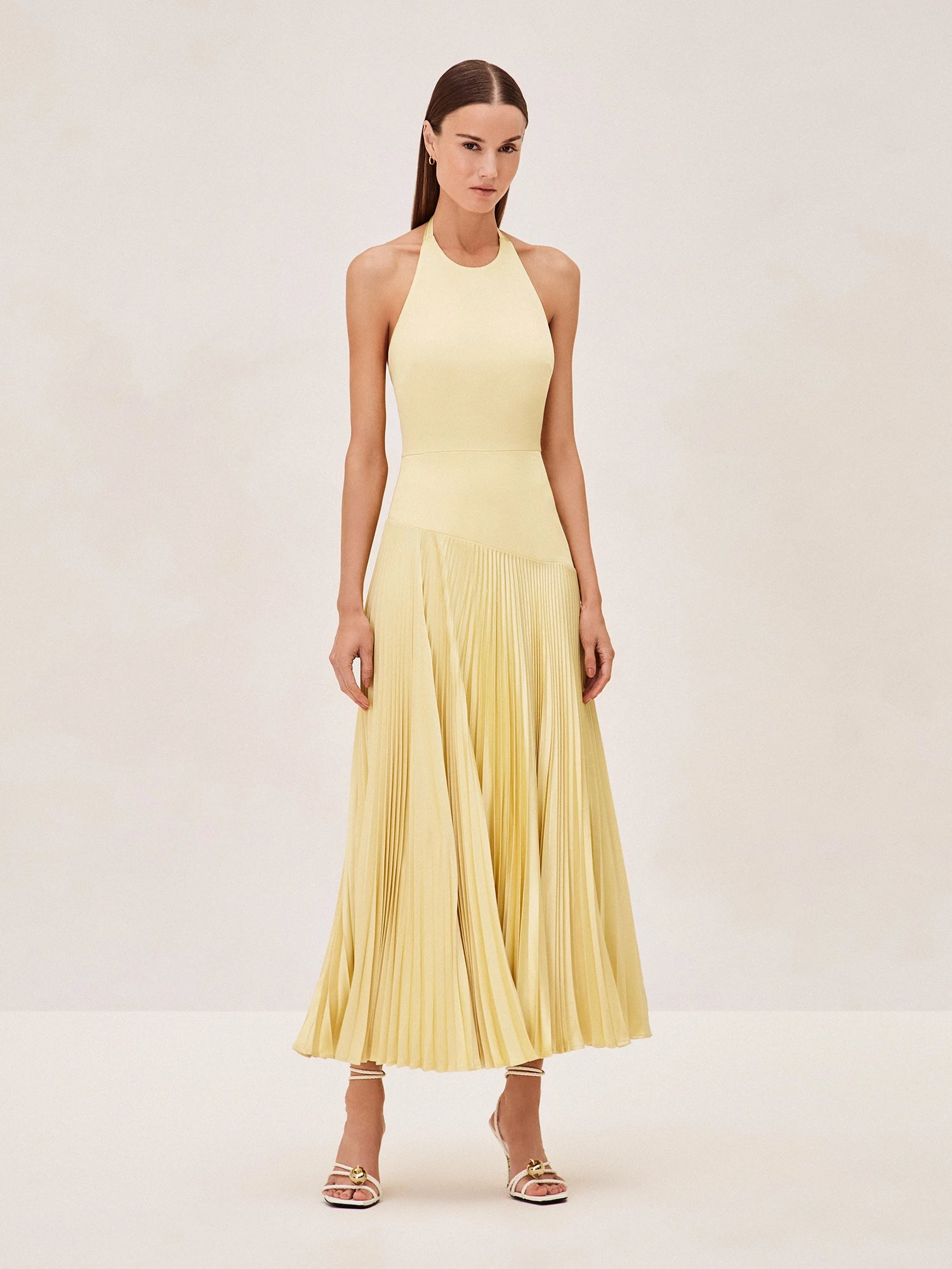 The Saab Dress, with its halter neckline, invites a modern twist to the classic silhouette. This dress features a beautifully pleated skirt that creates a soft, flowing movement, accentuated by an asymmetrical hem. Perfect for your next event. It pairs seamlessly with delicate sandals, embodying a sophisticated yet fresh style.