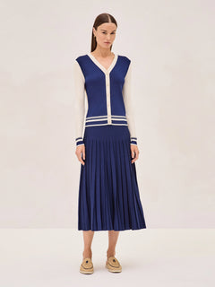 The Sanders Skirt brings a touch of classic prep to your everyday style with its sharp pleats and deep marine blue color. Versatile and fashionable, this standout piece is perfect for both smart-casual office attire and weekend events. Pair it with a crisp white blouse or a cozy knit cardigan like the Dinno for a polished look that is sure to impress.