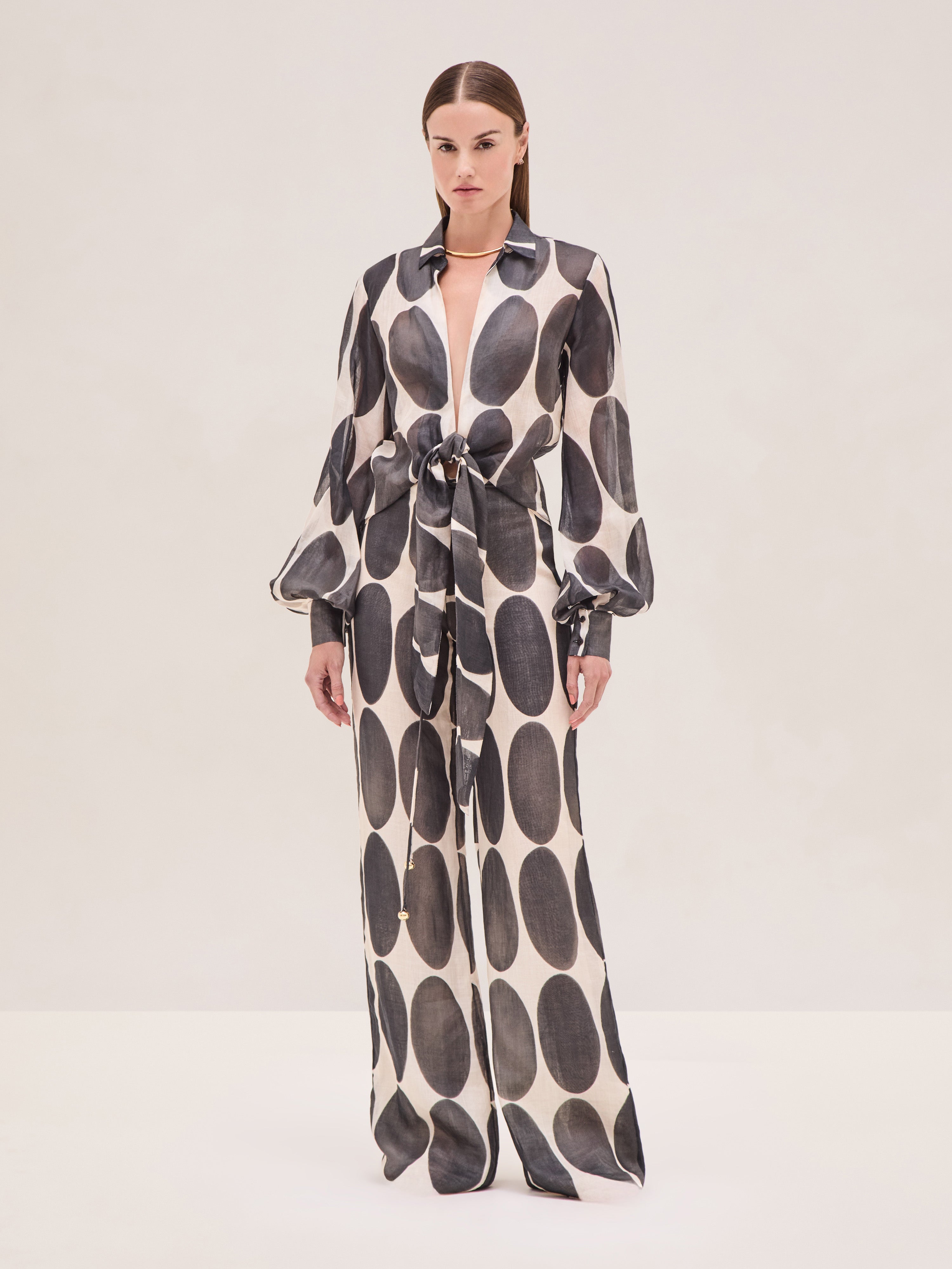 The Sarif Pant is a relaxed-fit pant with a back zip closure, paired with the Desai Top.
