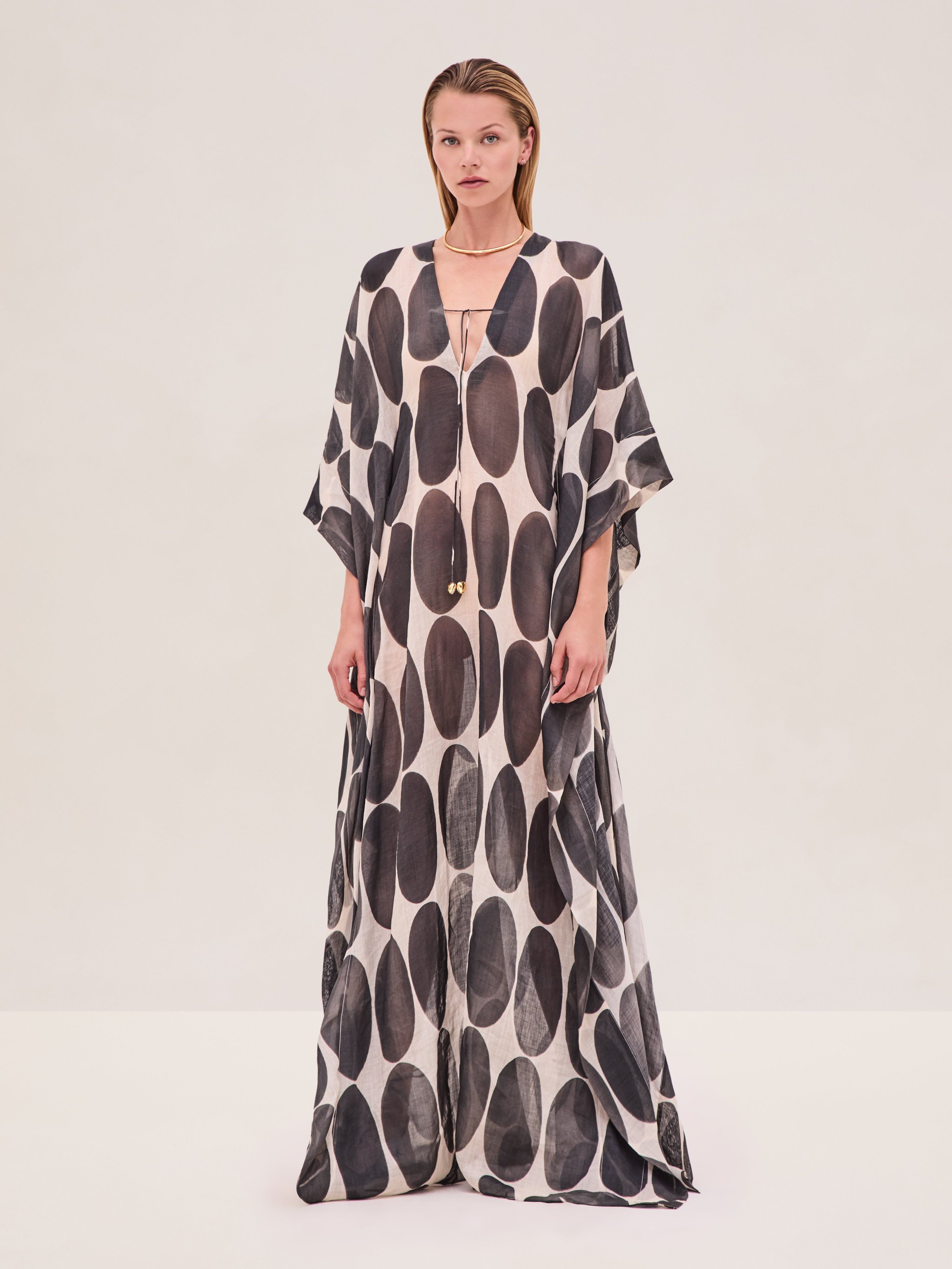 The Sierro Caftan is a maxi dress with a relaxed, flowing silhouette, featuring a slip for coverage and decorative cord ends.