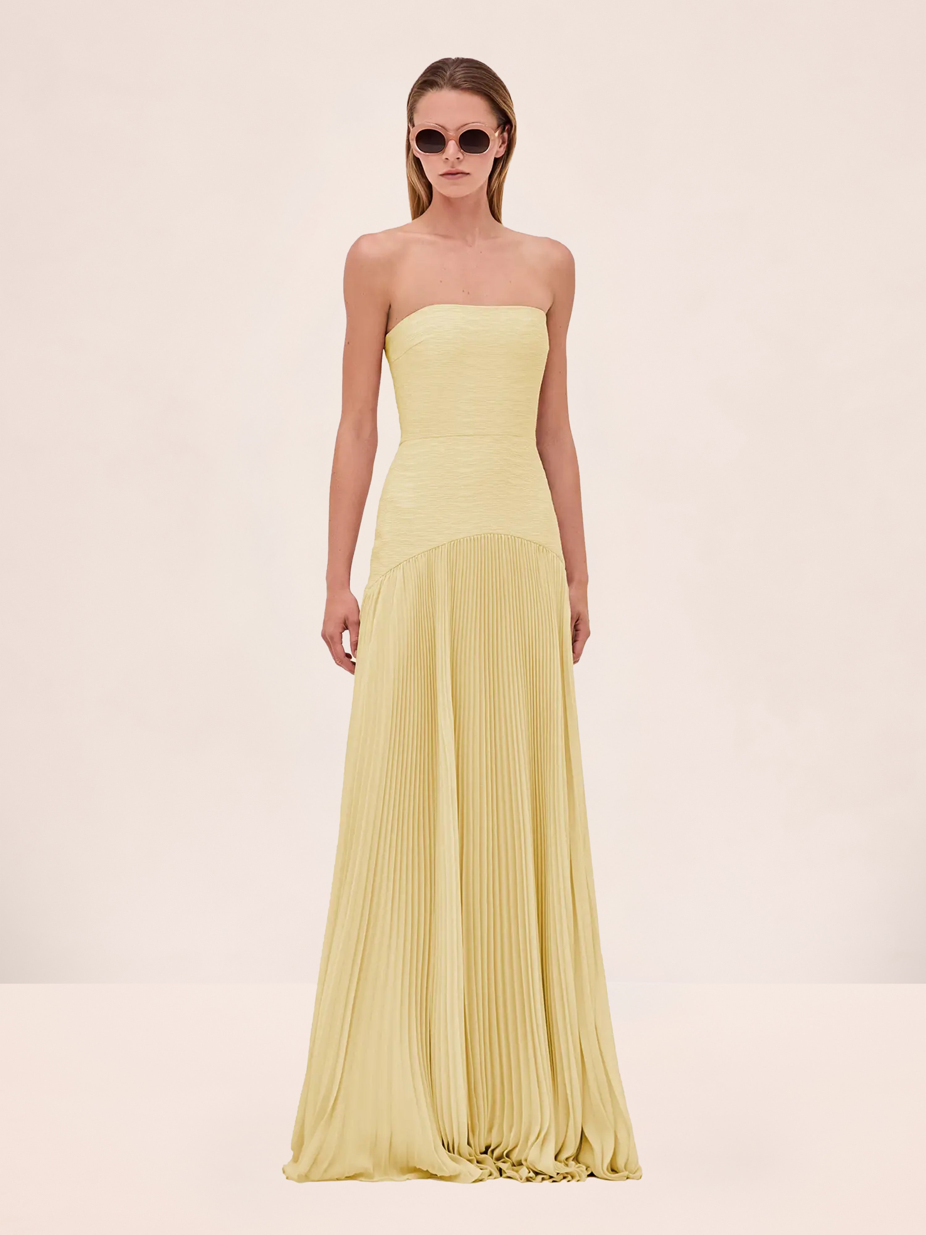 The Sunniva Dress is strapless gown with a fitted bodice and a floor-length pleated skirt.