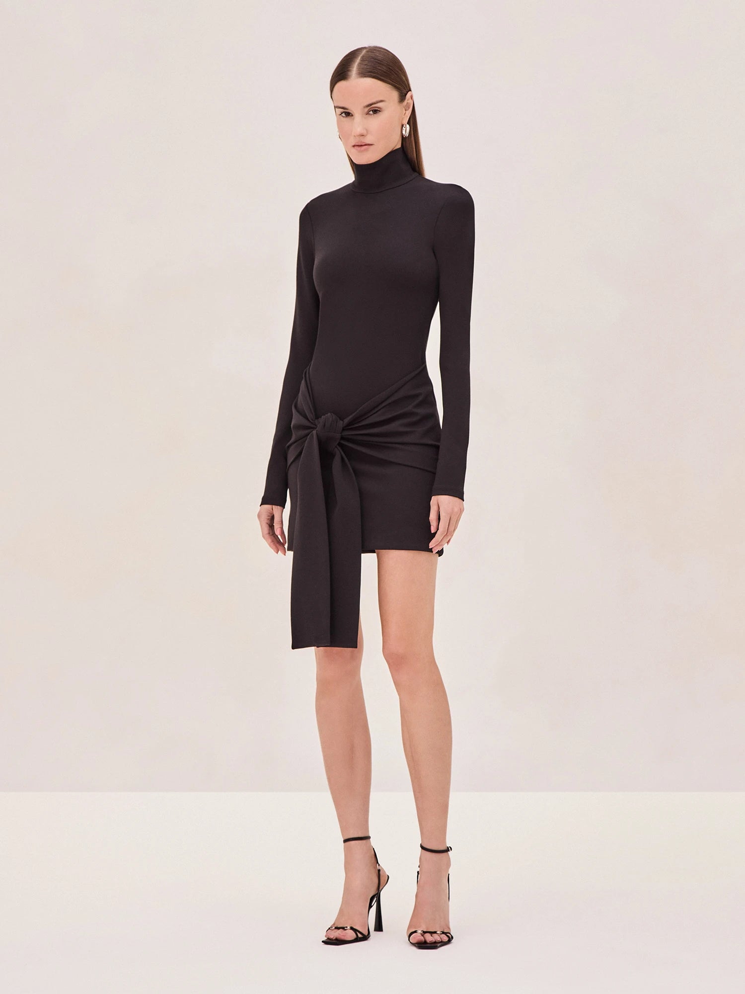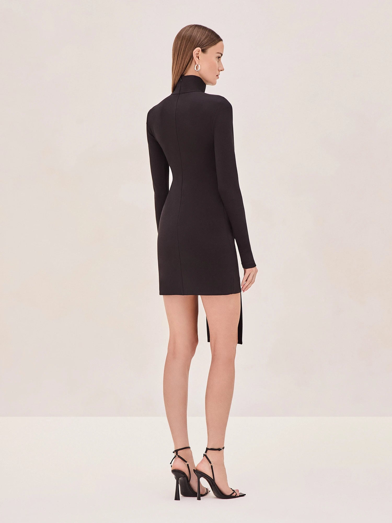 The Tracee mini dress features a high neckline and long, fitted sleeves that bring a sophisticated edge to its minimalistic silhouette. The asymmetrical draping at the hip adds a unique twist, creating a flattering and elongating effect.