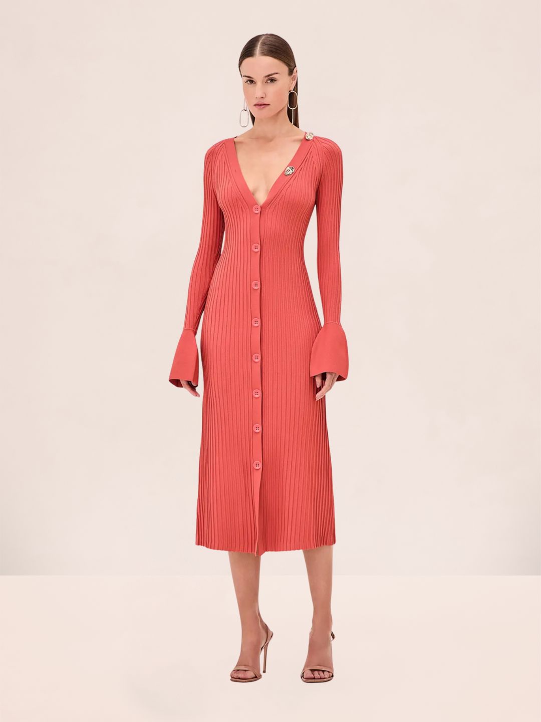 The Trisha Dress is a ribbed knit midi dress with a deep V-neckline, flared cuffs, and a button-front closure.