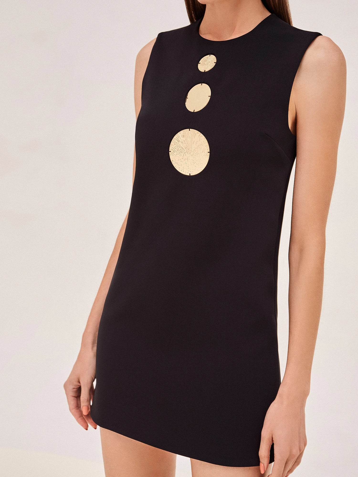 Elevate your wardrobe with the Vango Dress, the epitome of minimalist elegance. This sleeveless sheath dress features a sleek silhouette that skims the body with grace. The high neckline adds a touch of sophistication, while the distinctive gold-tone coin embellishments inject an air of opulence, making a statement without the need for excess.